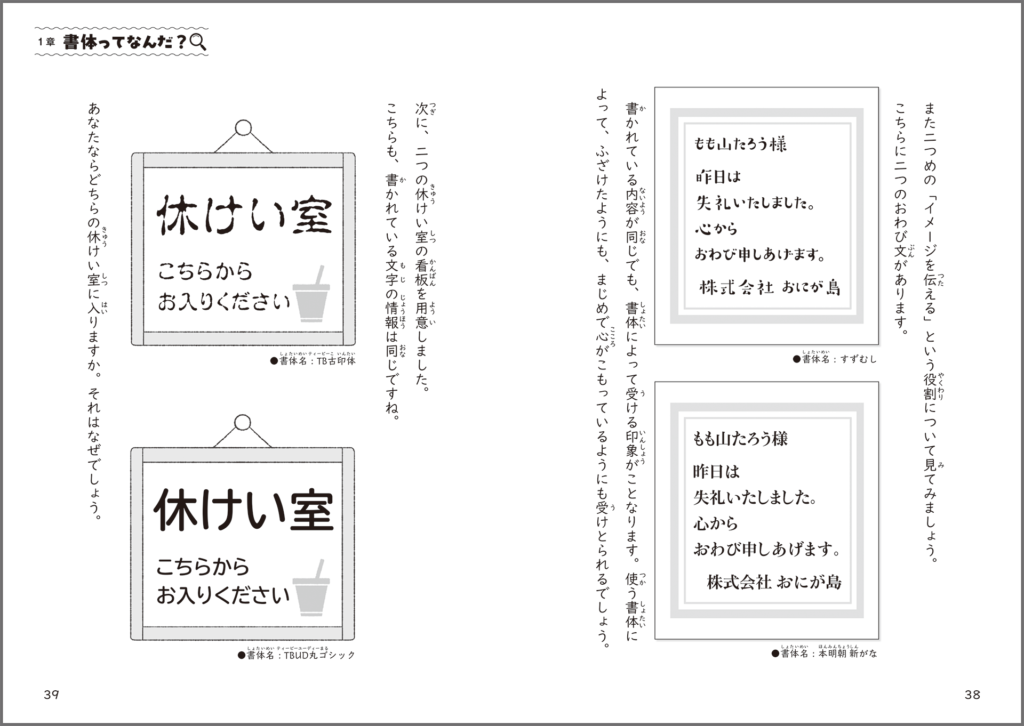 「書体ってなんだろう?」「世の中にはどんな書体があるのだろう?」と、まずは身の回りに目を向けたくなるカラーページからスタート。お子さまが自分ごととして、書体やユニバーサルデザインに向きあうきっかけにもなるはずです。