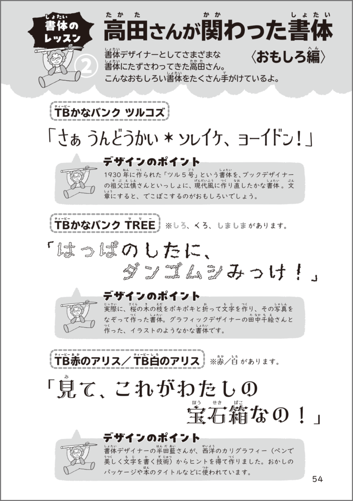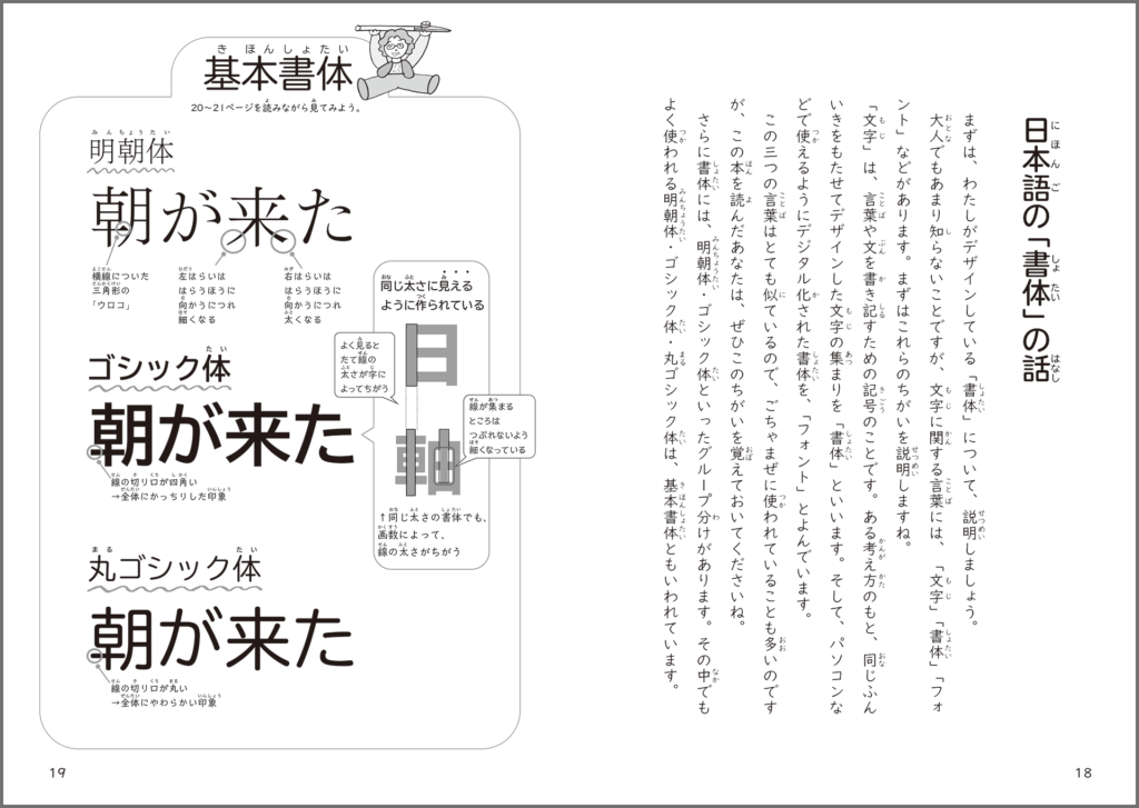 章と章の間には、三大書体(明朝体、ゴシック体、丸ゴシック体)をキャラクター化して紹介したり、高田さんが今まで手がけてきた書体を紹介したりするコラムも。書体の楽しさや奥深さを、ビジュアルとともに理解できます。