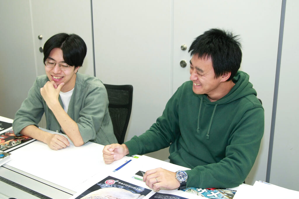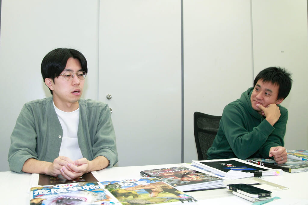 今回は陸と海の王者をテーマに、一冊まるごと1つのモチーフを追いかけるという大胆な図鑑づくりに挑んだ松原(ティラノサウルス担当)と高田(サメ担当)に、図鑑づくりの舞台裏とそこに込めた思いを聞いてみた。