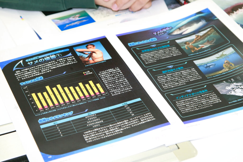 高田 「僕は、後半のサメの被害データページが推しですね。サメって危険だと言われるけど、実際にどれくらい危険なのかを数字で見ると、意外と少ない。むしろ人間がどれだけサメに影響を与えているかを考えさせられるページなんです。数字で怖さを見せるっていうのが面白いと思って、多方面から情報を詰め込みました(笑)」