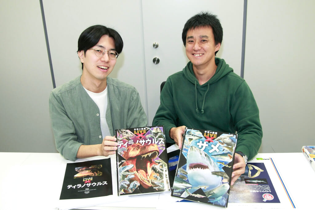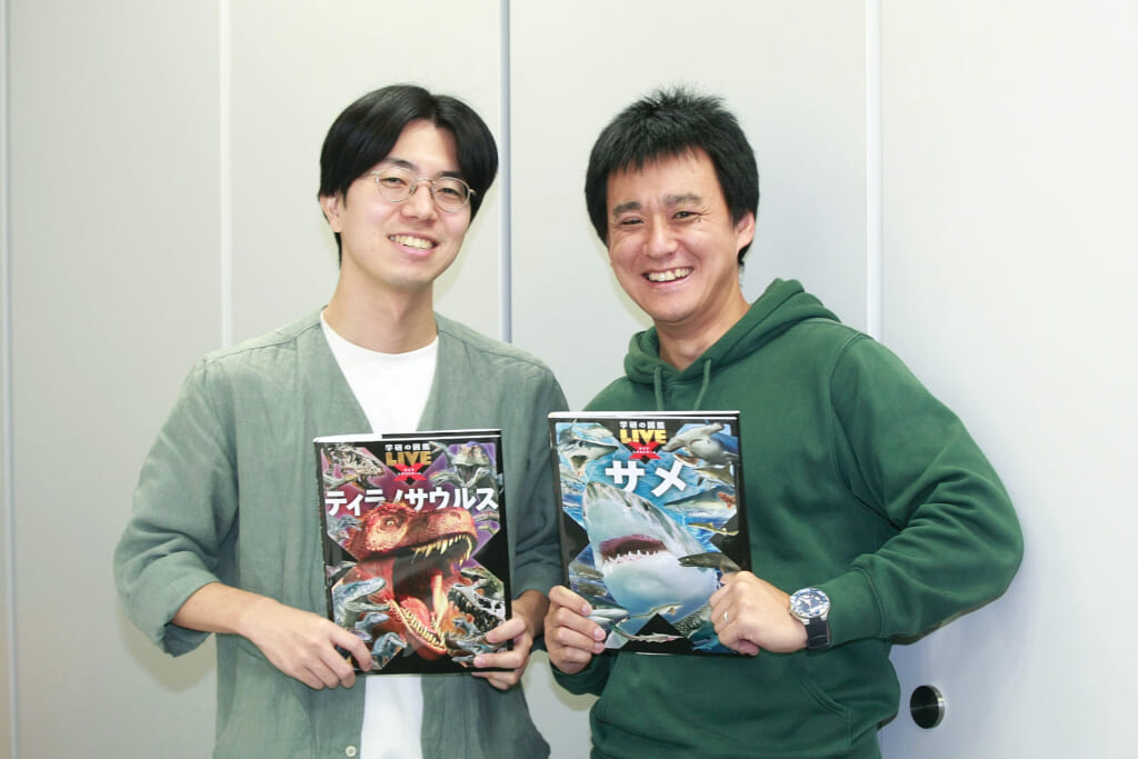 今回は、“ティラノサウルスと“サメ”という人気モチーフを、科学的な視点で徹底的に掘り下げた『学研の図鑑LIVE エクストリーム』(2025年11月27日発売 ※)の制作チームにフォーカス。ティラノサウルス担当の松原由幸と、サメ担当の高田竜が、“好き”をとことん追いかける図鑑づくりの舞台裏と、そこに込めた学びのエネルギーについて語ります。